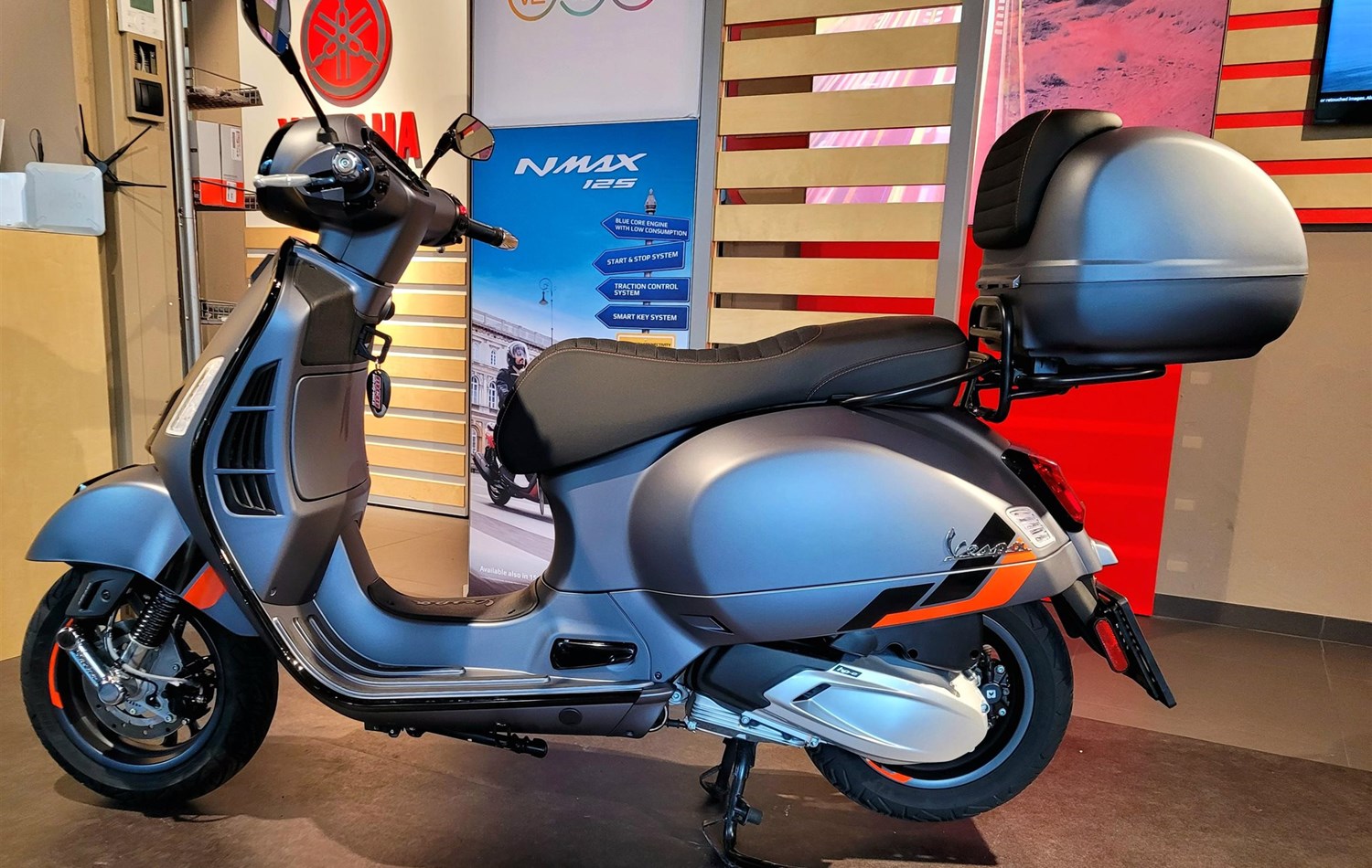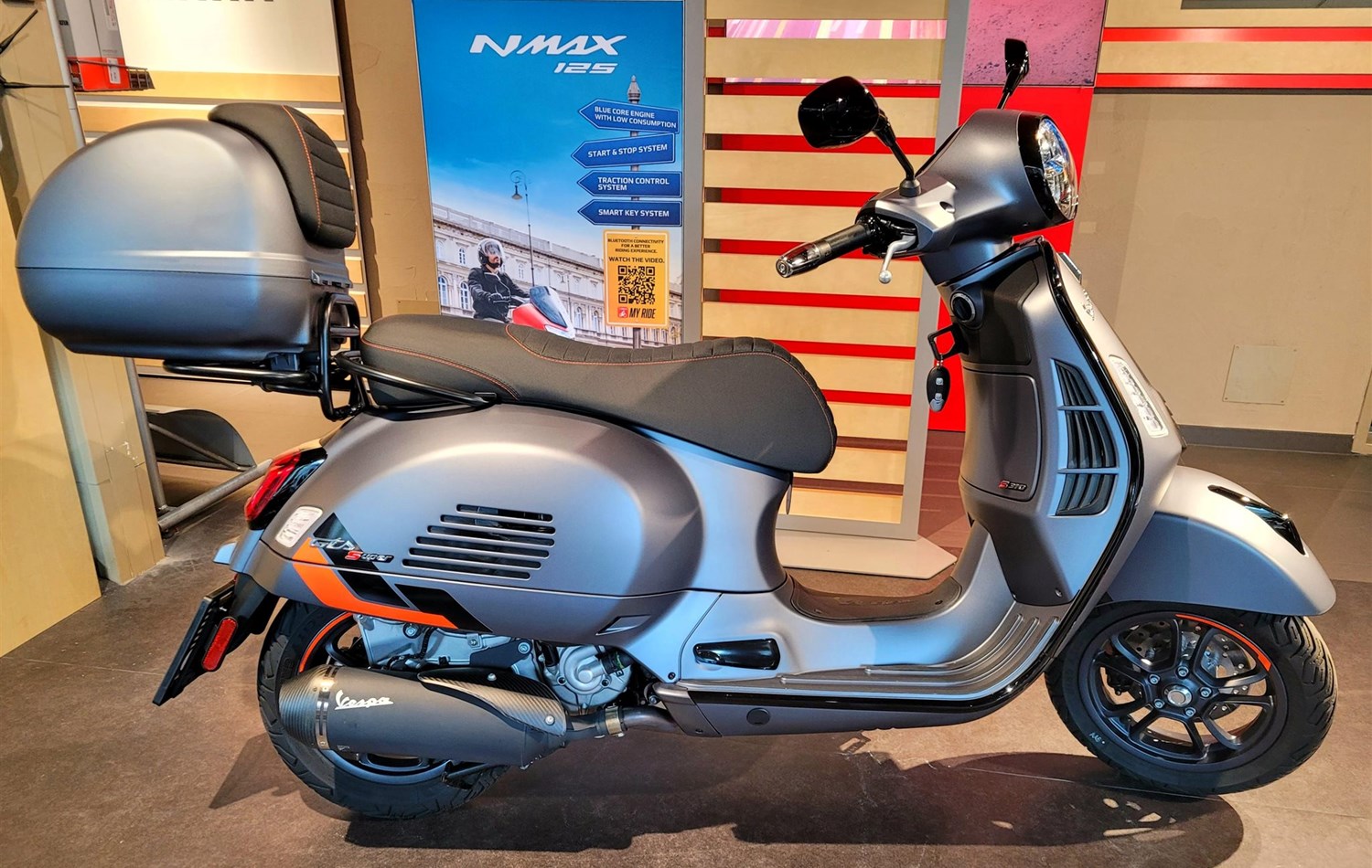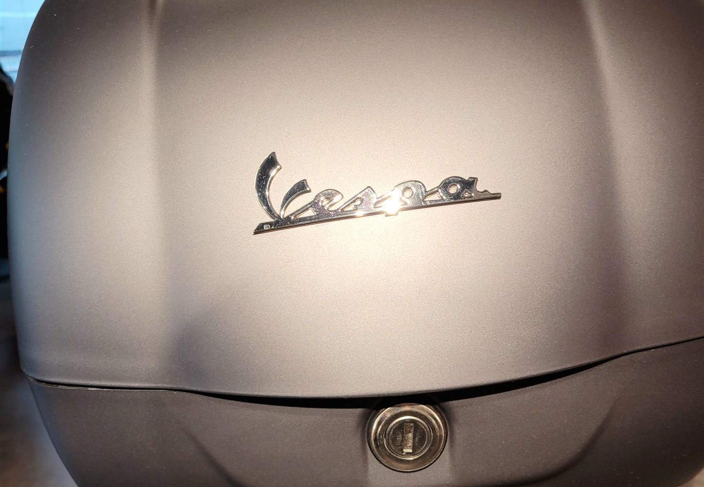 Original Vespa Gepäckträger (schwarz) und Topcase in Fahrzeugfarbe mit Rückenlehne.